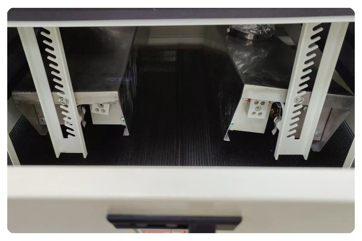 يتم التحكم في الحزام الناقل لآلة المعالجة UV بعرض 1000 مم بواسطة محرك كهربائي، ويمكن تعديل سرعته على أساس سرعة الإنتاج المطلوبة لتتناسب مع متطلبات التجفيف المختلفة.