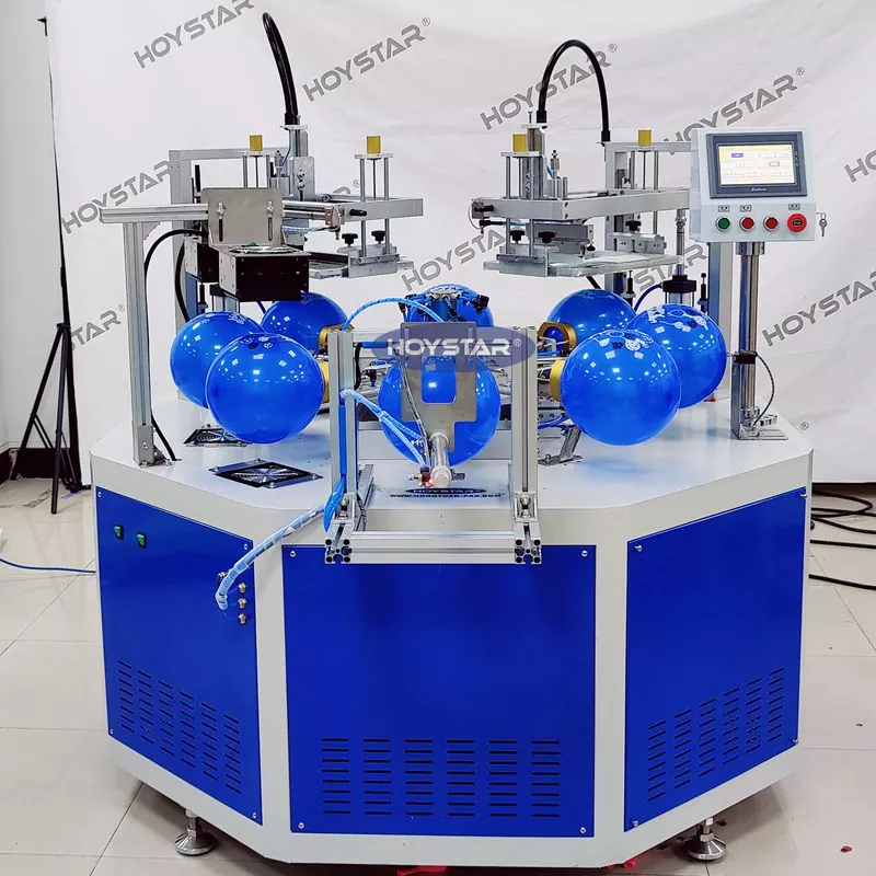 باعتبارها الشركة المصنعة والموردة المهنية، تم تصميم آلة طباعة الشاشة الحريرية الأوتوماتيكية ذات اللونين HOYSTAR للطباعة على بالونات اللاتكس. مجهزة بمنضدة عمل دوارة، نفخ تلقائي، دوران تلقائي، تجفيف تلقائي، وظائف التفريغ التلقائي. التحكم بشاشة اللمس PLC، واجهة سهلة الاستخدام لتشغيل آمن وبديهي. تجمع الآلة بين السرعة والدقة وسهولة الاستخدام.
